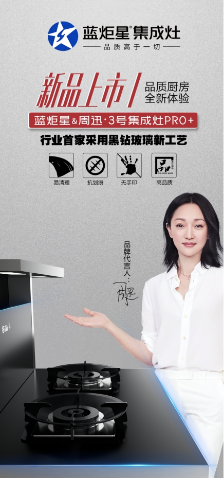 藍炬星&周迅·3號集成灶PRO+,行業首家采用黑鉆玻璃新工藝,帶給你未曾想象的品質廚電。