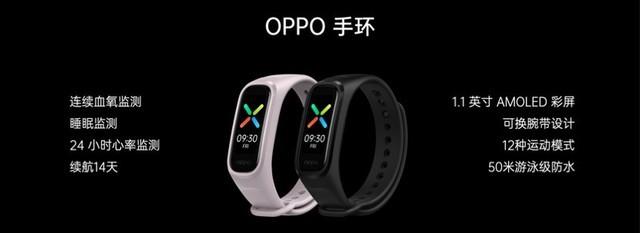 第三款智能硬件新品是OPPO手環。主打運動健康,支持連續血氧檢測、12種運動模式;OPPO手環時尚版定價249元,標準版199元。