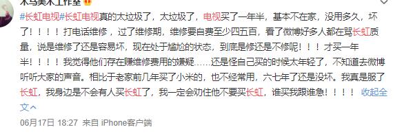 還有的網友吐槽稱,“千萬不要買長虹電視,一年修三次,換三次主板。”