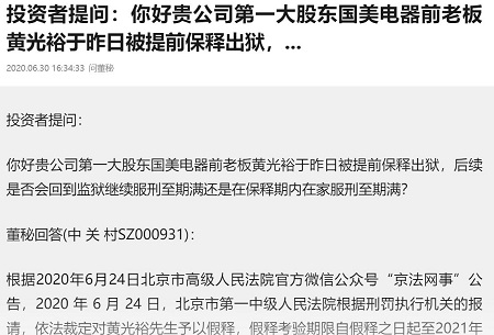 導讀: 家電消費網6月30日訊 上周,國美創始人黃光裕提前出獄的消息引發社會各界高度關注。今天下午,有投資者問國美系中關村(SZ000931),公司第一大股東國美電器前老板黃光裕被提前保釋出獄,后續是否會回到監獄