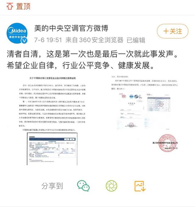 美的中央空調還表示,“清者自清,這是第一次也是最后一次就此事發聲。希望企業自律,行業公平競爭、健康發展。”(溫麗雅)