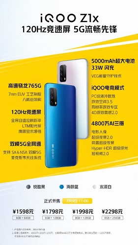 iQOO Z1x搭載了高通驍龍765G, 采用7nm EUV制程工藝,主頻高達2.4GHz,GPU型號為Adreno 620,圖形渲染速度提升10%。此外配合X52基帶,iQOO Z1x還支持NSA/SA雙模5G組網。采用后置三攝組合,其中主攝擁有4800萬物理像素點(默認輸出120萬像素)支持Hyper-HDR超級逆光拍攝,可以輕松應對各種大光比環境,還支持多風格美顏、超級夜景2.0等功能。此外,該機還配備了200萬像虛化攝像頭與200萬像素微距鏡頭。