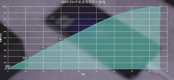 其次,iQOO Z1x配備了33W閃充,讓手機快速充電。在33W閃充的加持之下,實測iQOO Z1x用10分鐘可以從1%充到14%,20分鐘充到30%,半小時充到44%,充滿電用86分鐘。