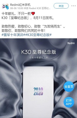 “十年獻禮,不只一款。K30至尊紀念版,8月11日發布。致敬熱愛,致敬初心,致敬為發燒而生。”Redmi紅米手機表示,“致敬你,致敬我們共同的十年。”