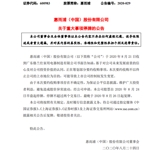 惠而浦中國今天起停牌,最晚于2020年8月26日起復牌。