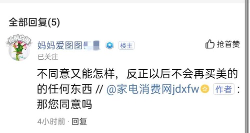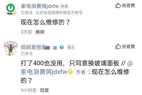 如今的消費(fèi)者,對(duì)美的電器還停留在對(duì)其設(shè)計(jì)、質(zhì)量表示不滿,而不奢望其有高科技的階段。登陸微博等社交平臺(tái),可以看到美的洗衣機(jī)、美的冰箱、美的空調(diào)都出現(xiàn)過(guò)爆炸。“美的熱水壺的壺嘴設(shè)計(jì)不科學(xué),在往小口徑倒水的時(shí)候很容易倒在外邊,造成人員燙傷。我剛被燙完!希望美的研發(fā)團(tuán)隊(duì)能夠好好反思,設(shè)計(jì)出更多人性化的產(chǎn)品。”“我家的美的燃?xì)庠钜脖。美的只同意換一塊玻璃鋼板。”
