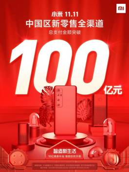 家電消費網11月11日訊 今天11月1日-11月11日凌晨3點25分,小米集團中國區新零售全渠道總支付金額突破100億元,超越去年小米雙十一的銷售額記錄。