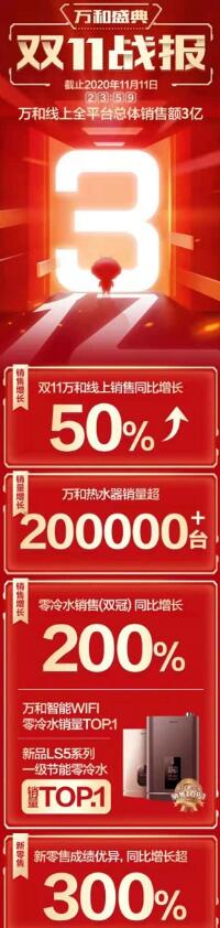 家電消費網11月12日訊 今天,我國廚衛領導品牌萬和電氣公布的雙十一戰報顯示,11月11日零點至零點42分,僅用了四十二分鐘,銷售額就超過了去年的同期總額。雙十一期間,萬和成交額超過3億元,銷量超過20萬臺。其中,萬和零冷水熱水器銷量18萬臺,位居行業第一。萬和官方商城銷售總額同比增長300%以上。