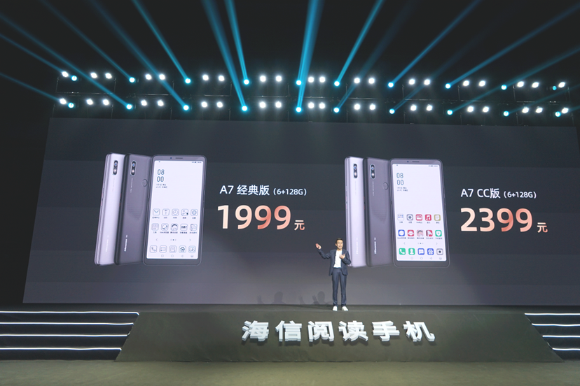 海信5G閱讀手機A7經典版6+128G版本售價1999元, 今天在京東開售,首批購機用戶可享京東12期白條免息等3重福利; 彩墨屏CC版6+128G版本售價2399元。(段燕量)