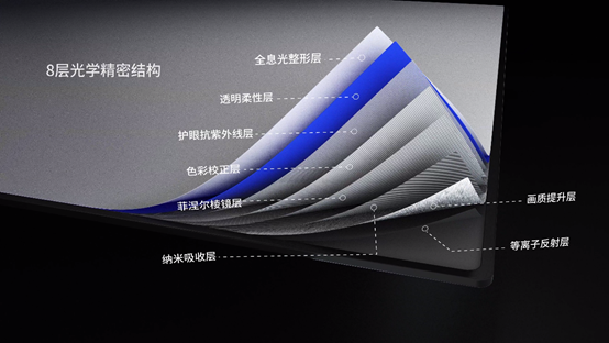 具體來說,ALFA技術(shù)實現(xiàn)了專利微納結(jié)構(gòu)設(shè)計、全息光整形技術(shù)、光吸收納米涂層、超薄柔性復(fù)合薄膜四大技術(shù)層面的突破,用復(fù)雜的光學(xué)光刻方法做了屏幕的表面處理,使其在保持了高清、高畫質(zhì)顯示狀態(tài)的同時,又可以消除鏡面反射的效果,解決了傳統(tǒng)投影屏幕的低增益、亮斑、“鬼影”等諸多行業(yè)痛點。