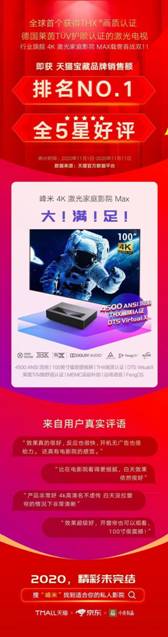 除此之外,作為峰米科技在今年下半年推出的旗艦產(chǎn)品,峰米4K激光家庭影院Max也在雙11中取得天貓寶藏品牌銷售額第一名的好成績,并收獲全5星一致好評,充分說明了這款產(chǎn)品的超強實力。