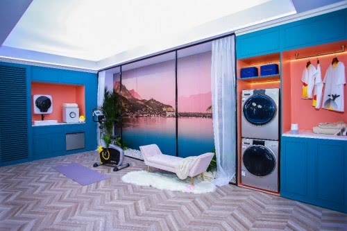 在“女王的陽光健身房”場景下,寶媽既可以騎上健身車鍛煉,也可以在瑜伽墊上做身材塑型。運動之后,衣服放進能洗烘聯動的洗衣機、干衣機,即洗即穿,不占用傳統陽臺空間,鞋子可以放進洗鞋機里清洗。此外,寶寶的衣物交給壁掛洗衣機,與大人的衣物分開洗護,健身、帶娃兩不誤。
