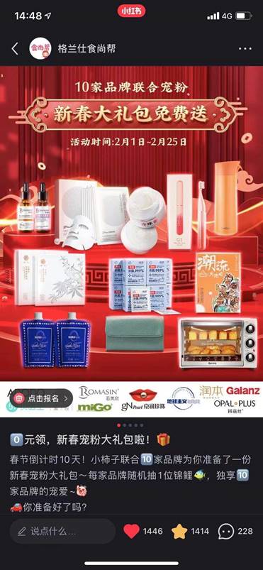 小紅書平臺以“春節不打烊,快樂迎牛年!”為主題,格蘭仕與10大品牌聯合寵粉,豐厚年貨整裝待發,抽取10位錦鯉送出牛氣沖天大禮包!截止到目前聯動數據,閱讀量、點贊量、收藏量、評論量都已高達幾千。