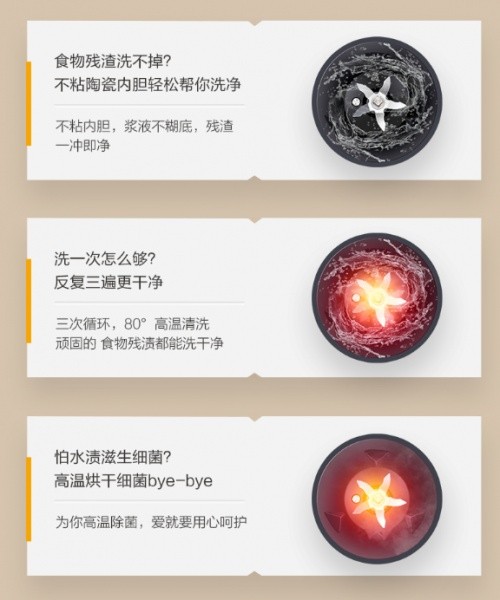 破壁機清洗是一大難題,尤其在寒冷的冬季。美的全自動破壁機制作完后會自動進入清洗環節,中途完全無需人工干預,隨后就會自動把工作艙等關鍵部位清洗干凈。首先全方位高壓沖洗杯體,軟化污漬,清洗無殘留;之后再三次80度循環高溫洗;最后熱烘干燥除菌,避免殘留水導致細菌滋生,干凈還衛生!