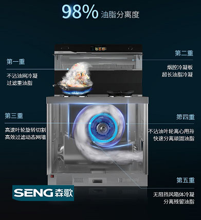 10~25cm黃金控煙區的設計,不等油煙擴散就被全部吸凈排出,更不會影響我們的身體健康。五重油脂分離技術可實現達98%油煙分離度,位居行業第一。分離出來的廢油通過分離直接進入底部油箱,一拉一倒,干凈一步到位。