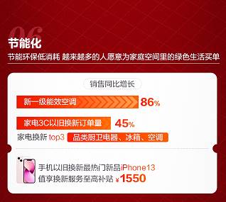 綠色低碳成為消費者買單的重要參考依舊。數據顯示,新一級能效空調線上銷售同比增長86%。