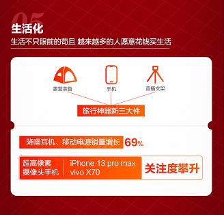 受短途旅行影響,國慶節期間,手機、直播支架、無人機等成為新的旅行三大件。蘇寧易購平臺數據顯示,帶有超高清攝像功能的新品手機iPhone 13 pro max、vivo X70等產品關注度攀升,降噪耳機、移動電源等旅行必備單品銷量增長69%。