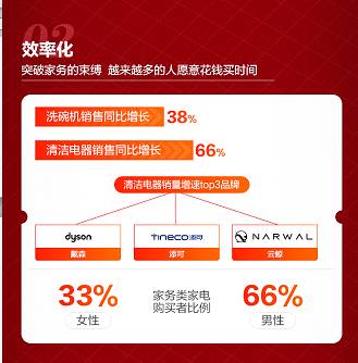 除了購買選擇上追求效率外,消費者對解放雙手的功能需求也不斷膨脹。洗碗機、洗地機和烘托一體機的銷量出現大規模增長。其中,洗碗機銷售同比增長38%,清潔電器銷售同比增長66%,戴森、添可、云鯨等清潔電器銷量喜人。有趣的是,購買清潔家電的男性是女性的2倍。