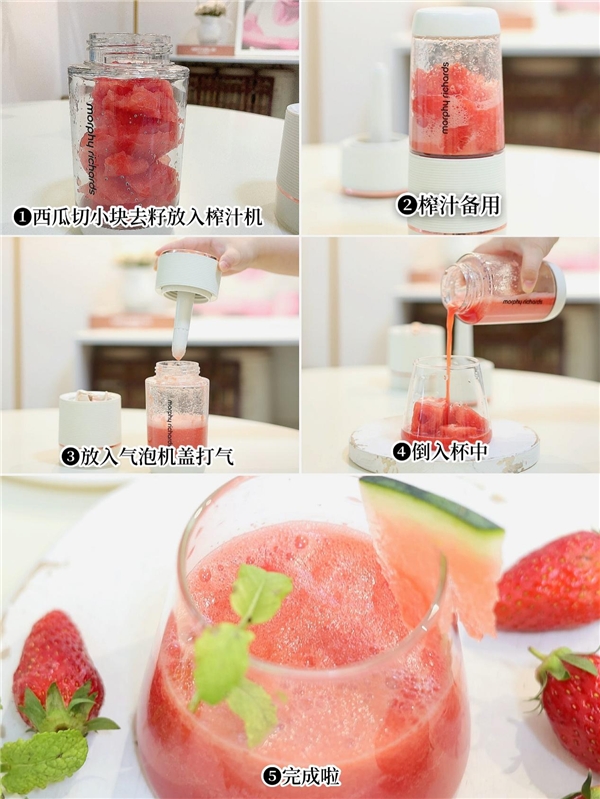 接著,用摩飛氣泡果汁杯鮮榨西瓜汁。喜歡氣泡水的小伙伴還可以給西瓜汁“打氣”,變身“西瓜氣泡飲”。