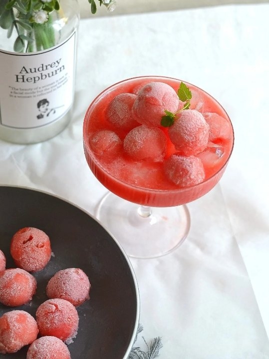 在西瓜氣泡飲里放入冷凍好的西瓜冰球,一道高顏值的西瓜冰淇淋就好了。