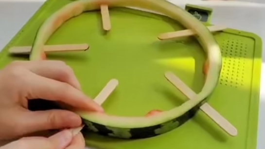 先切一大片西瓜,小心掏出果肉,記得把西瓜籽留下,然后把雪糕棒均勻的插進西瓜皮中。