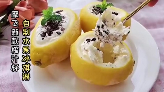 先把檸檬果肉,放入摩飛氣泡果汁杯,開啟40秒鮮榨模式,然后加奶油、糖和煉乳打發,放回檸檬殼,撒上奧利奧碎,最后冷凍一下,新鮮出爐的“檸檬精”就可以吃啦!