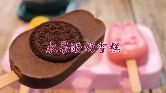 將草莓、芒果切塊,奧利奧錘碎+酸奶,用摩飛氣泡果汁杯中榨汁;然后擠入冰棍模具,冷凍5小時,自制水果酸奶雪糕就做好了!