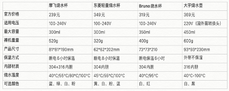 為了方便大家對四款燒水杯有個大致的了解,我在下面整理了一個表格,可以讓大家能夠更加直觀的感受。
