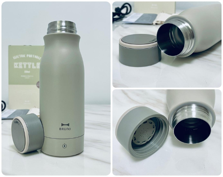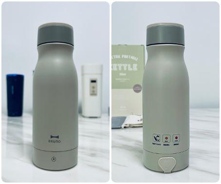 若說摩飛和東菱外觀與普通保溫杯有些相似,那么從Bruno燒水杯開始,可能就不太像傳統的保溫杯了,整體造型更像一個小奶瓶。我買的這一款是云霧灰,配置方面倒是沒有什么變化,依舊是燒水杯主機、電源線、絨布收納袋。