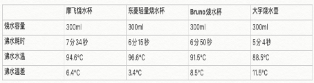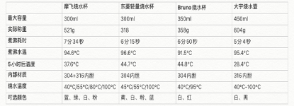 忙活了半天,終于到了總結部分,先來看四款燒水杯的參數和性能對比。其中涉及沸水數據的部分,測試水量都是300ml。