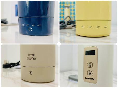 摩飛可以進行40℃/55℃/80℃/100℃四個檔位加熱,東菱可以進行45℃/55℃/100℃三檔加熱,Bruno可以進行紅燈95℃/橙燈40℃兩檔加熱,無法100℃沸水燒開,大宇可以進行40℃~100℃的任意燒水檔位。