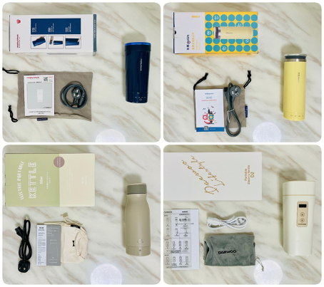 拿到貨之后首先要做的就是開箱啦,先來看看四款燒水杯都長什么樣子,包含哪些配件吧!