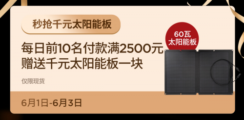 除抽獎外,在6月1日~3日,每日現貨前10名付款滿2500元的用戶都會送一塊價值1099元的太陽能充電板,讓你的戶外電源充電擁有更多選擇。