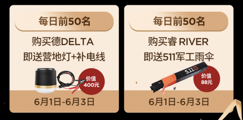 如果你在6月1日~3日,每日前50名購買 DELTA戶外電源也貴送你營地燈和補電線,如果是前50名購買 RIVER的用戶則送你一把511軍工雨傘,其贈品還是相當給力的。