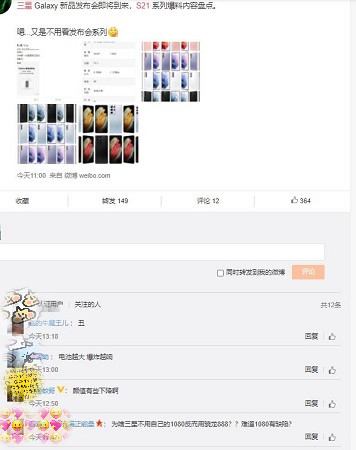 不過,國內消費者并沒有被三星S21豪華的配置打動。今天家電消費網在微博上看到,有網友表示,“丑”,“顏值有些下降啊”,有網友則表示,“電池越大,爆炸越響”。