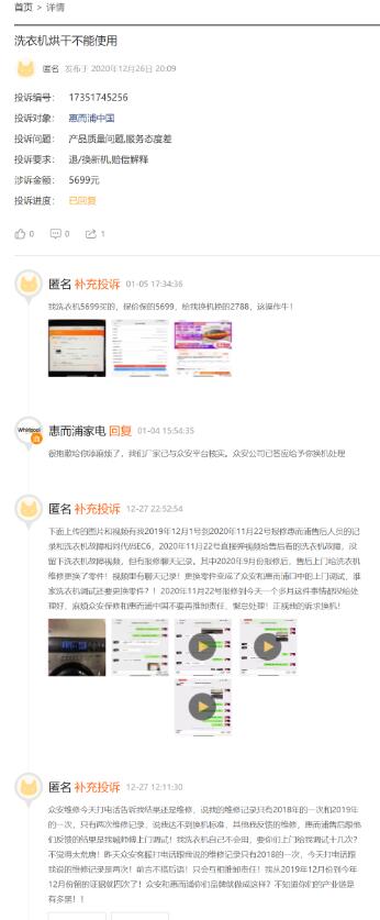 家電消費網1月14日訊 2021年新年來到,可消費者劉先生(化名)沒有迎來新年的歡樂,而是繼續投訴惠而浦中國。