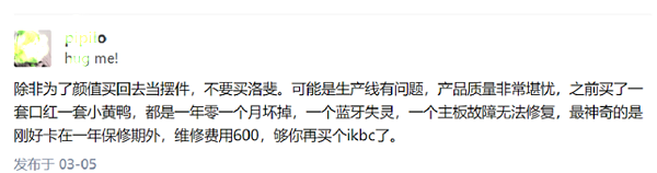 日前,有北京消費者投訴稱洛斐鍵盤一年后按鍵失靈,售后維修費高達500元。不少網友則吐槽,洛斐鍵盤體驗差,手腕累,不好用,是收割智商稅,不建議買。(杜佳)