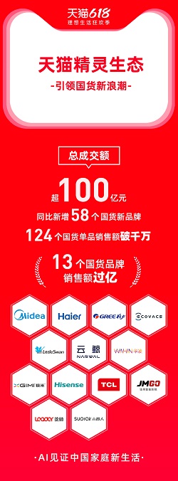 家電消費網6月21日訊 在今年618大戰前夕,阿里云于5月27日成立了新設經營主體——浙江貓精人工智能科技有限公司。今天,“貓精”曬出了首個618成績單:截止6月21日0時,天貓精靈及智能家居生態總成交額已經超過100億元,獲超54項細分品類TOP1。其中中國本土品牌表現突出:本次共有 124個國貨單品銷售額超過千萬,在所有千萬級單品中占9成以上;13個國貨品牌銷售額過億;而較于去年同期,天貓精靈生態中還新增了58個國貨新品牌。