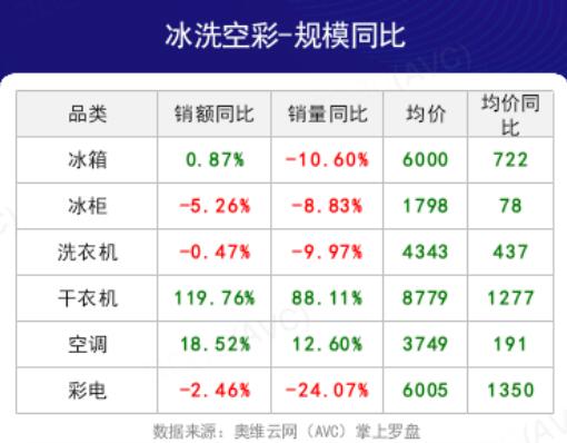 價(jià)格方面,冰箱同比增加722元,洗衣機(jī)同比增加437元,空調(diào)同比增加191元,彩電同比增加1350元。