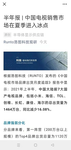 導(dǎo)讀: 家電消費(fèi)網(wǎng)7月15日訊 今天,洛圖科技(RUNTO)發(fā)布的《中國電視市場品牌出貨月度追蹤》報(bào)告中顯示:2021年上半年,中國大陸前7大國產(chǎn)電視品牌,包括小米、海信、TCL、創(chuàng)維、長虹、康佳、海爾的總出貨量為14