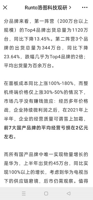 洛圖分析師認(rèn)為,在面板成本同比上漲100%-180%,而整機(jī)終端價(jià)格僅上漲30%-50%的情況下,市場幾乎沒有賺錢效應(yīng):經(jīng)歷多年價(jià)格戰(zhàn),企業(yè)持續(xù)微利潤之后,在2021年上半年,企業(yè)的經(jīng)營質(zhì)量可謂雪上加霜,前7大國產(chǎn)品牌的平均經(jīng)營虧損在2億元左右。