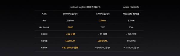 真我15W MagDart磁吸無線閃充,創造性的將充電器的主板和線圈分離,分置在充電插頭和充電板兩端,一方面將兩種熱源分開,減少了充電過程中的發熱情況,可以保持更長的高功率充電時間,另一方面讓充電板變得更薄。真我15W MagDart磁吸無線閃充的厚度僅有3.9mm,比MagSafe充電器薄26.4%,比四張銀行卡疊在一起還要薄,即便采用了超薄磁吸設計,也只需90分鐘即可將4500mAh的realmeFlash充至100%。