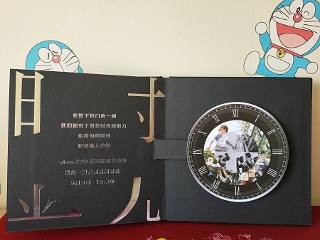 邀請函用素雅的牛皮紙包裹,打開后里面是一個黑色的硬殼“相冊”。封面上刻印著拆分的“時光”二字。翻開“相簿”,第一頁上寫有“蔡司影像 品閱時光”字樣。第二頁左側寫有“在按下快門的一刻 我們擁有了留住時光的能力 定格如畫瞬間 記錄動人美好 vivo X70系列新品發布會 邀您一起共同品閱時光 9月9日 19:30”。右側是一個展開式表盤設計。