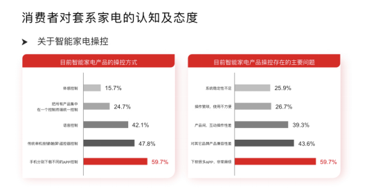 《白發(fā)書》顯示,經(jīng)過對(duì)近1800名消費(fèi)者和家居設(shè)計(jì)師等市場(chǎng)調(diào)研,當(dāng)前套系家電需要解決的問題是智能終端控制的開放性及兼容性,過于封閉會(huì)導(dǎo)致消費(fèi)者在使用過程中的不良體驗(yàn),甚至對(duì)整體智能化設(shè)計(jì)產(chǎn)生抵觸情緒。調(diào)研過程中,近六成的被訪者對(duì)智能終端操控更需要“下載很多APP,非常麻煩”表示不滿。
