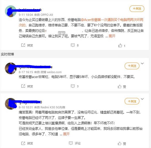 隨后家電消費網(wǎng)在微博和黑貓投訴中看到不少消費者對Acer宏碁電腦的投訴,主要集中在“主板壞了”、"屏幕漏光"、"花屏"等。