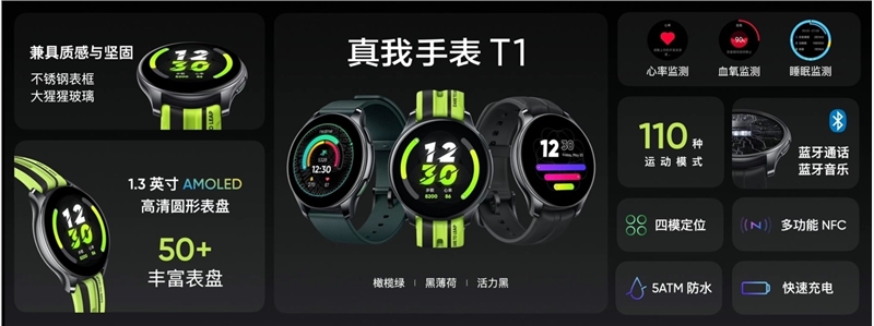 realme首款智能手表T1配備 1.3 英寸圓形表盤,采用大猩猩玻璃、不銹鋼表框,325ppi 高清 AMOLED 屏,支持 50Hz 全局高刷。有 50 多種豐富表盤,支持 110 種運動模式,還支持全面健康監測、藍牙通話、藍牙音樂、5ATM 防水、磁吸快充、多功能 NFC 等。有三款配色,分別為:活力黑、橄欖綠、黑薄荷。真我手表 T1 的價格為 699 元,活力黑配色版本限時 599 元。