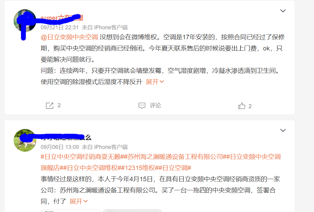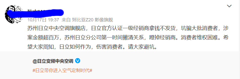 隨后家電消費(fèi)網(wǎng)在微博上看到,不少蘇州消費(fèi)者投訴蘇州日立中央空調(diào)店經(jīng)銷商拿到消費(fèi)者購買空調(diào)的錢后不發(fā)貨,稱涉案金額超百萬。其中有人從今年春天一直等到了秋天,仍未得到明確答復(fù)。
