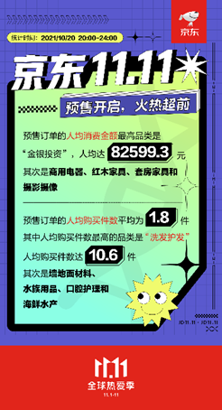 京東母嬰開啟預售4小時內,嬰幼兒奶粉預售金額同比增長近7倍,飛鶴、伊利、愛他美、美贊臣等品牌同比增速超10倍。京東生鮮開啟預售4小時內,生鮮定金單量同比提升619%,預售金額同比提升729%,贛南臍橙、大連海參、阿克蘇蘋果、谷物雞蛋、冰糖橙、車厘子等時令生鮮產品,受到消費者的青睞。10月20日20點-24點,京東自有品牌總成交額同比增長117%,總訂單數同比增長 115%,其中京造總成交額同比增長110%。