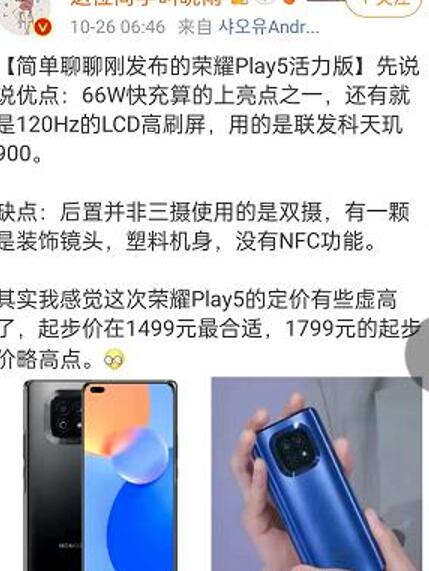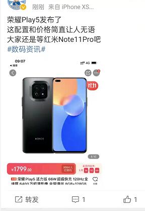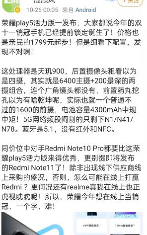 有網友表示,“同價位,Redmi Note10 Pro都要比榮耀Play5活力版來得優秀,更別提即將發布的Redmi Note11了。”