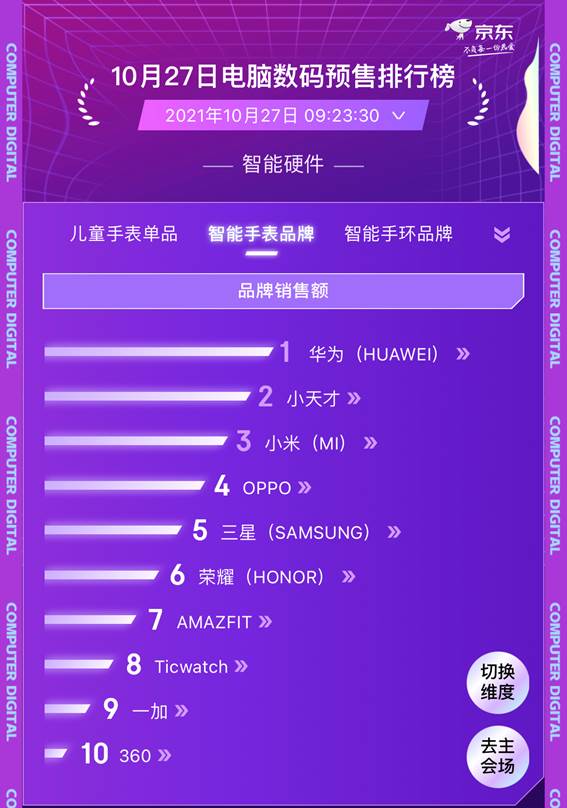 京東11.11電腦數碼預售排行榜發布:華為位居智能手表銷售額第一